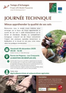 À l'occasion de la journée mondiale des sols, le LIFE Biodiv'Paysanne organise d’une matinée pour échanger sur la façon de mieux appréhender la qualité de ses sols à partir d'observations sur le terrain et d'analyses élargies au compartiment biologique. L’objectif est de mieux comprendre l'impact des pratiques agricoles (notamment la fertilisation et le travail du sol) pour ainsi mieux cibler les pratiques améliorantes.