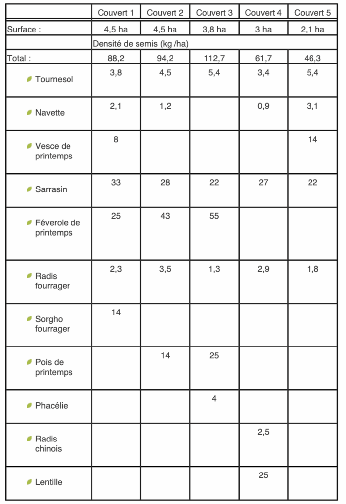 Le mélange est principalement constitué de semences fermières (achat de radis fourrager et de phacélie, sorgho, vesce, moha).