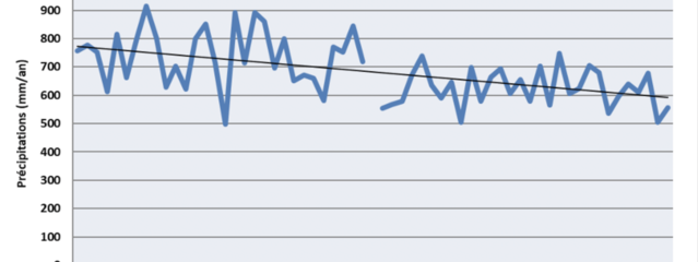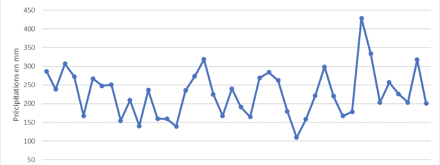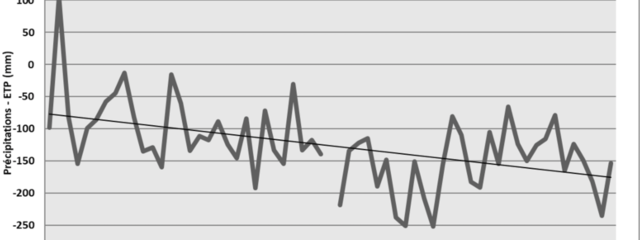 Le déficit hydrique est la différence entre les précipitations et l’évapotranspiration des cultures, donc grossièrement la différence entre les entrées et sorties d’eau. C’est un bon indicateur pour caractériser la sécheresse. Nous avons ici le déficit hydrique sur la période déclarée de sécheresse par Jean Hamot, de 1979 à 2020. On remarque une légère augmentation de ce déficit sur les 40 dernières années, notamment sur l’année 2020 qui a été relevée par l’agriculteur.