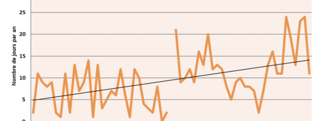 La hausse tendancielle des températures annuelles se confirme localement sur la période d’analyse, à l’image de la situation plus générale en France. Cette hausse concerne tous les paramètres (températures moyennes, minimales et maximales) et provoque ici une mauvaise pollinisation du maïs (voir plus bas). On observe également une hausse des jours chauds (> 25°C) et des jours très chauds (> 30°C).