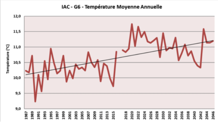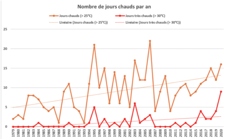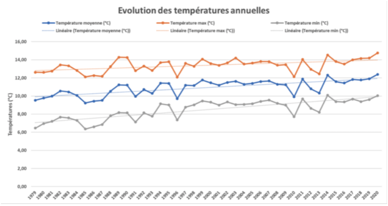 La hausse tendancielle des températures annuelles se confirme localement sur la période d’analyse, à l’image de la situation plus générale en France. Cette hausse concerne tous les paramètres (températures moyennes, minimales et maximales) et provoque ici un mauvais remplissage des grains (voir plus bas). On observe également une hausse des jours chauds (> 25°C) et des jours très chauds (> 30°C).
