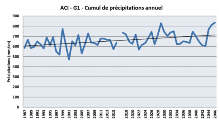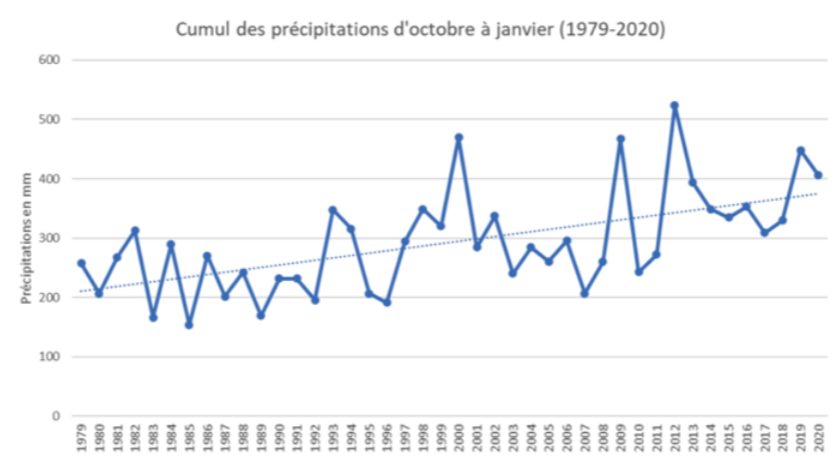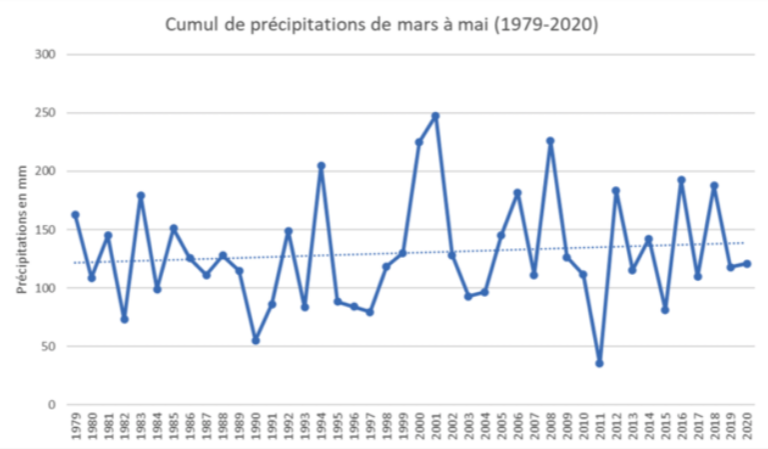 Nous avons ici les précipitations sur la période déclarée de sécheresse par Marc Lefebvre, de 1979 à 2020. On remarque une légère augmentation sur les 40 dernières années. En regardant mois par mois, il n’y a pas de changements significatifs de mars à mai. On remarque cependant une forte variabilité entre les années. Les années déclarées en sécheresse par Marc Lefebvre (2019, 2020) sont effectivement plus basses sur le graphique que 2018. On peut supposer que la répartition de l’eau est irrégulière, avec plusieurs semaines en sécheresse, entrecoupées d’épisodes de fortes pluies.