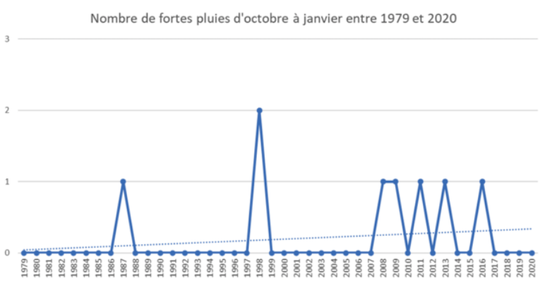 Voici le cumul des précipitations sur la période déclarée comme excédante en eau par Marc Lefebvre. On remarque une franche augmentation sur les 40 dernières années. De plus, les deux graphiques ci-dessous présentent le nombre de fortes pluies (> 25 mm/jour), sur l’année et sur la période octobre-janvier, témoigne aussi d’une augmentation tendancielle. Ainsi, l’aléa d’excès d’eau se remarque bien sur ces graphiques, et les années relevées par l’agriculteur ressortent bien (2019 et 2020).