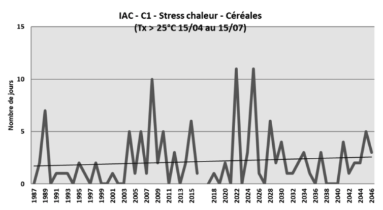 L’inertie climatique à l’échelle du globe implique une continuité des évolutions climatiques déjà observées localement dans les prochaines décennies. Les Indicateurs agroclimatiques suivant sont construits à partir des projections climatiques locales et illustrent les principaux enjeux climatiques pour un système grandes cultures.