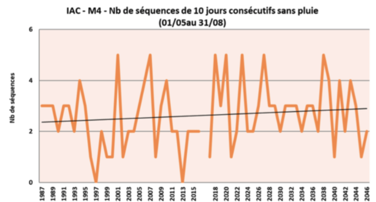 Cet indicateur le nombre de séquences de 10 jours consécutifs sans pluie, du 1er mai au 31 août. Ces séquences peuvent causer des sécheresses nuisant aux cultures d’hiver et de printemps : floraison, pollinisation, ou encore le remplissage des grains. De plus, de juillet à août, le maïs a de forts besoins en eau : 6-7 mm/jours pendant la floraison. Ainsi, l’aléa de sécheresse semble en légère augmentation dans les 30 années à venir. Comme on l’a vu sur le cumul de précipitations annuel, il y aura donc plus d’eau sur l’année, mais une répartition irrégulière, comme en témoigne ce graphique : des périodes de sécheresse entrecoupées d’épisodes de fortes pluies.
