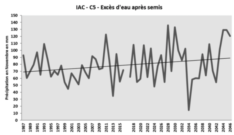 Cet indicateur présente le cumul des précipitations durant le mois de Novembre, qui évalue donc le risque d’excès d’eau après le semis de cultures d’hiver, comme le blé. Une quantité d’eau stagnante entraîne un déficit d’oxygène pour la plante : or les premières étapes du cycle de développement (germination – levée) sont très sensibles à l’hypoxie. Plus ce phénomène d’ennoiement continu perdure, plus les impacts seront importants, du retard de développement jusqu’à la destruction des pieds au-delà de 10 jours consécutifs, notamment pour le blé. C’est donc un aléa critique pour le blé et l’orge de l’exploitation. À l’horizon 2050 et d’après les projections, ces précipitations deviennent plus irrégulières et variables, avec une tendance à l’augmentation. Ainsi, le risque d’excès d’eau sera de plus en plus problématique d’après ces projections.