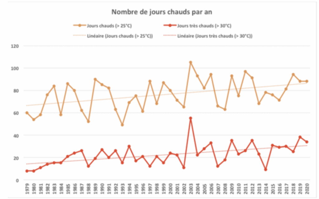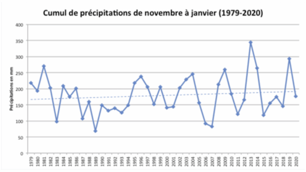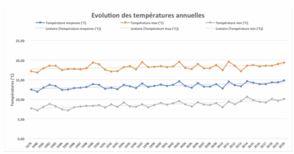 La hausse tendancielle des températures annuelles se confirme localement sur la période d’analyse, à l’image de la situation plus générale en France. Cette hausse concerne tous les paramètres (températures moyennes, minimales et maximales) et provoque ici un redémarrage de la pousse de l’herbe plus précoce (voir plus bas). On observe également une hausse des jours chauds (> 25°C) et des jours très chauds (> 30°C).