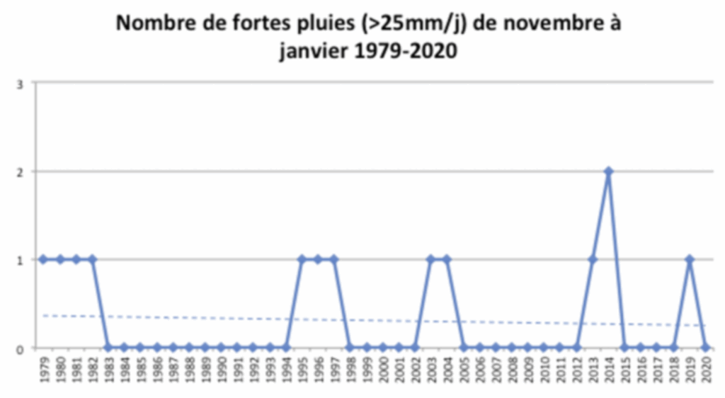 Voici le cumul des précipitations sur la période déclarée comme excédante en eau par Jonathan Kirchner. On remarque une petite augmentation, qui reste assez modérée sur les 40 dernières années. Le graphique ci-dessous présente le nombre de fortes pluies annuelles (>25 mm par jour), qui ne semble pas augmenter. On remarque sur les deux graphiques que l’année 2019, qui avait été citée par l’éleveur comme critique, a été effectivement sujette à de fortes pluies. Ainsi, l’aléa d’excès d’eau tend à augmenter de façon modérée.