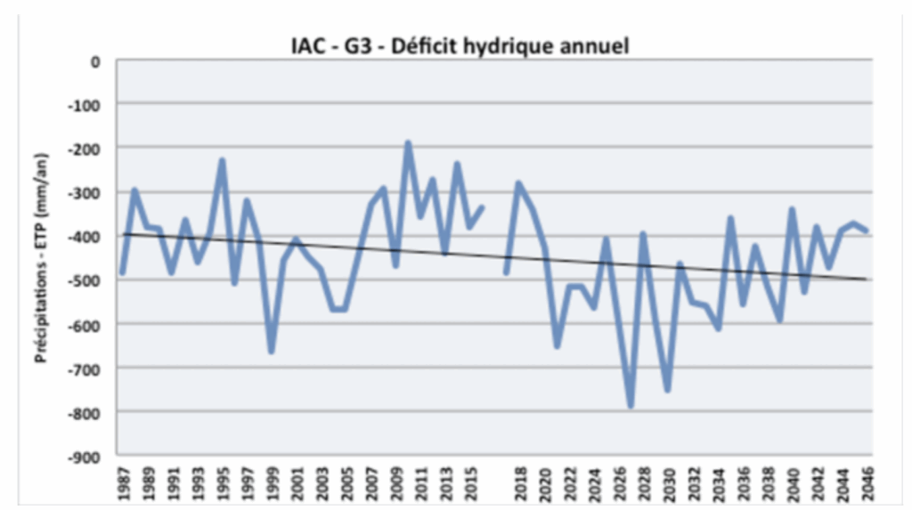 Voici les projections à l’horizon 2050 pour les températures moyennes et le déficit hydrique annuel. Le déficit hydrique est la différence entre les précipitations et l’évapotranspiration des cultures, donc grossièrement la différence entre les entrées et sorties d’eau. C’est un bon indicateur pour caractériser la sécheresse. On remarque une franche augmentation des deux paramètres. Ainsi, les aléas de chaleur et de sécheresse semblent globalement avancer dans les 30 années à venir.