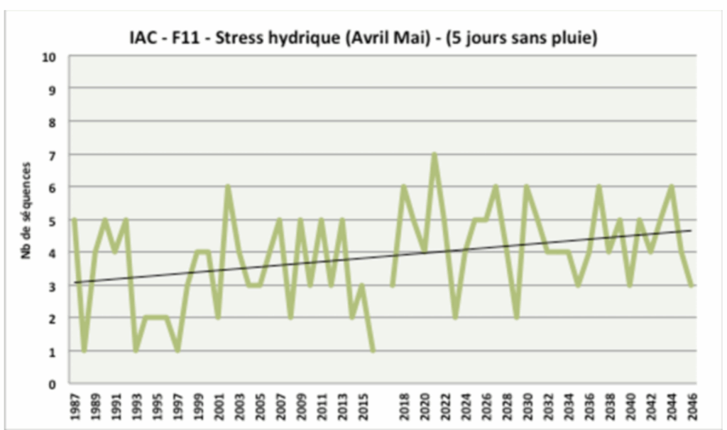 Cet indicateur présente le nombre de séquences de cinq jours sans pluie entre Avril et Mai. Cette période risque de connaître de plus en plus de sécheresses, ce qui peut impacter la pousse printanière de l’herbe, donc des prairies sèches durant l’été. On remarque sur le graphique une augmentation du nombre de séquences de stress hydrique à l’horizon 2050. Ainsi, d’après ces projections, la sécheresse s’étendra au printemps dans les 30 années à venir.