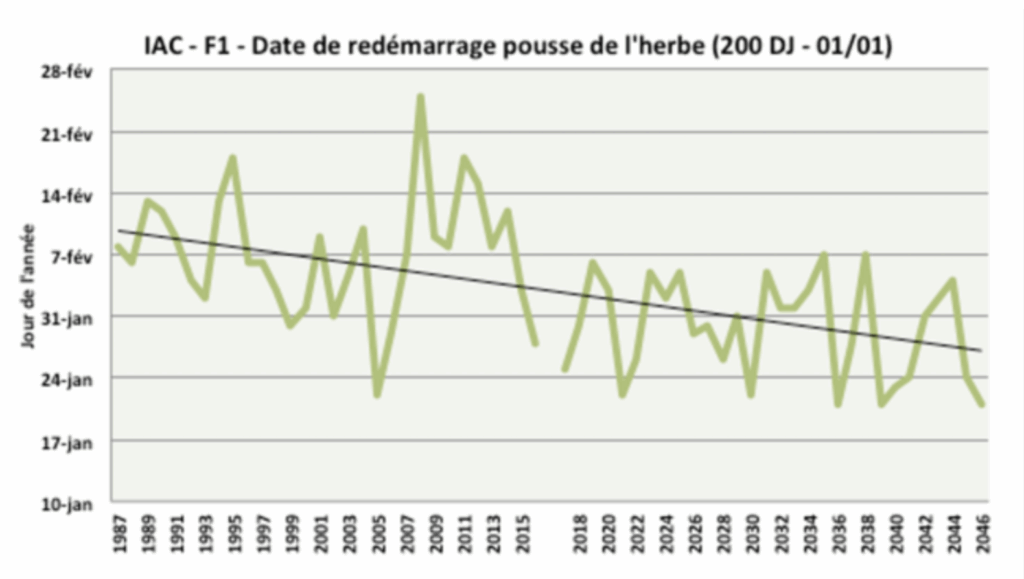 Même si la date de redémarrage de la pousse de l’herbe est assez variable d’année en année, elle semble devenir plus précoce dans un futur proche, tournant autour de mi janvier. Cela est induit par la hausse des températures. Actuellement, les brebis sont en bergerie sur la période janvier-février. Il sera intéressant, pour ne pas perdre de valeur nutritive, de décaler ces agnelages pour sortir les brebis durant cette période.