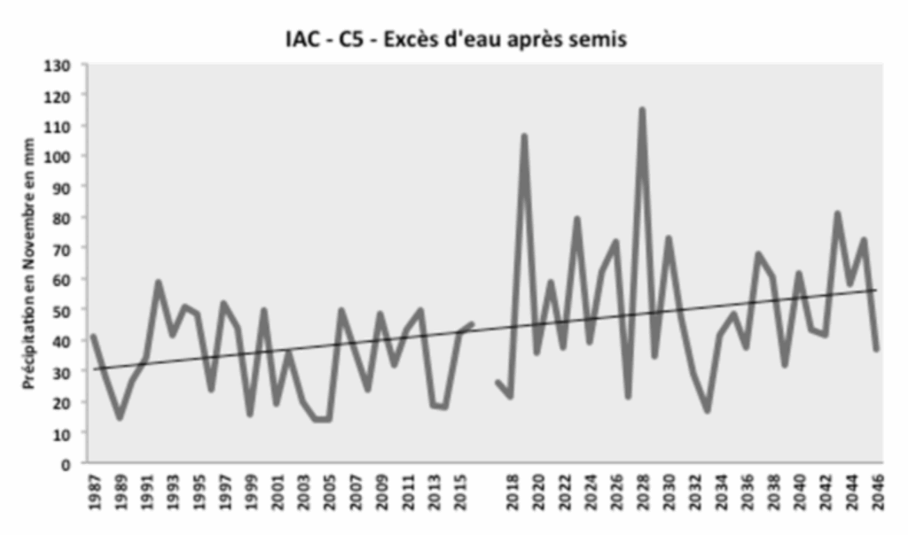 Cet indicateur présente le cumul des précipitations durant le mois de Novembre, qui évalue donc le risque d’excès d’eau après le semis des méteils. Une quantité d’eau stagnante entraîne un déficit d’oxygène pour la plante : or les premières étapes du cycle de développement des céréales d’hiver (germination – levée) sont très sensibles à l’hypoxie. Plus ce phénomène continu perdure, plus les impacts seront importants, du retard de développement jusqu’à la destruction des pieds au-delà de 10 jours consécutifs. À l’horizon 2050 et d’après les projections, ces précipitations deviennent plus irrégulières et variables, avec une tendance à l’augmentation. Ainsi, les problématiques d’excès d’eau et de décalage de dates de semis poseront de plus en plus problème d’après ces projections.