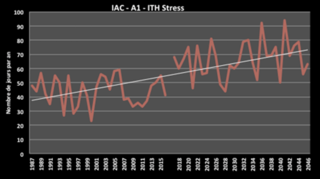 L’Indice Température Humidité (ITH) évalue le couple température et hygrométrie pour déterminer le niveau de stress thermique des animaux. Sur ce graphique figurent le nombre de jours de stress thermique par an. Ainsi, d’après ces projections, l’évolution du climat local va faire augmenter le nombre de jours de stress thermique des animaux. Actuellement, cela ne semble pas être un problème sur l’exploitation (d’après les déclarations de Jonathan Kirchner), mais cela pourrait le devenir avec cette augmentation. Ce sont des jours où les animaux seront moins productifs en lait, et la croissance des agneaux ralentie.