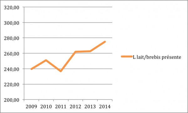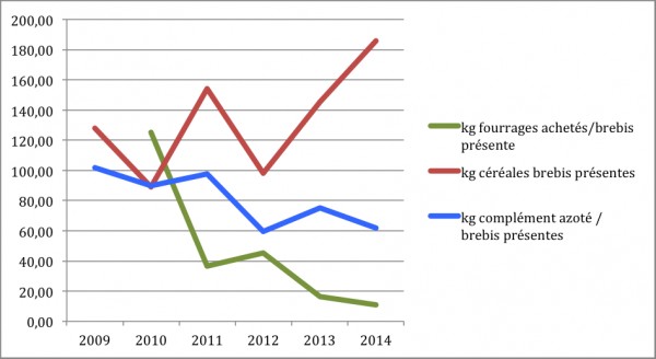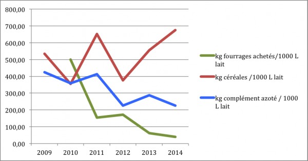 Les achats de foin à l’extérieur sont en forte baisse (un seul achat de 3 tonnes de pulpe de betterave en 2014). Les compléments azotés sont également en baisse. Quant aux céréales (maïs, avoine, orge), leur quantité est en augmentation pour accompagner la hausse de production laitière (elles assurent la part d’énergie nécessaire dans la ration).