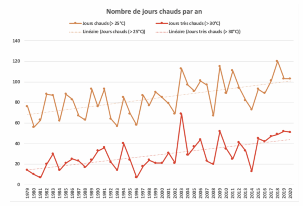Le nombre de jours chauds (Tmax > 25°C) et très chauds (Tmax > 30°C) sont en hausse tendancielle et semblent témoigner d’une dynamique similaire. Les années les plus récentes sont caractérisées par un indicateur de nombre de journées très chaudes relativement important (supérieur à 40 jours par an).