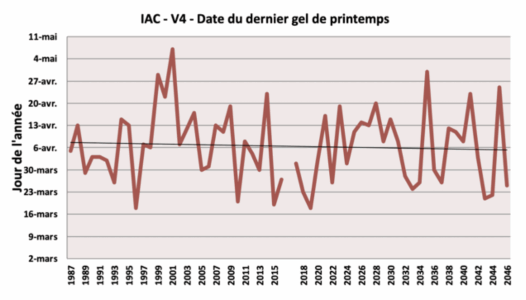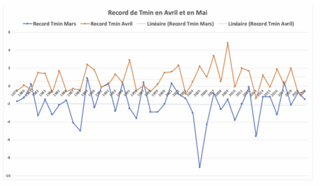 Toutefois, l’intervention de températures négatives au printemps (mois de mars et avril) subsiste, sur une végétation qui a tendance à être davantage développée par la hausse tendancielle des températures.