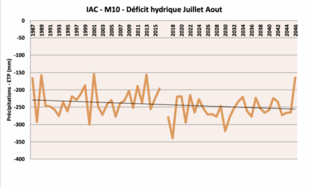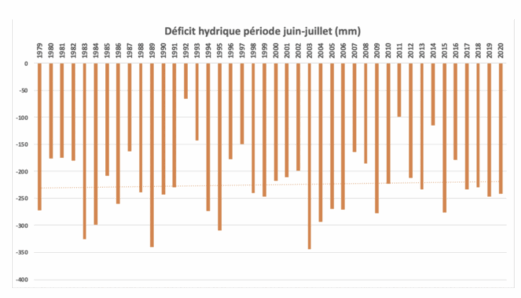 Le déficit hydrique est calculé par la différence entre pluviométrie et évapotranspiration, il est cumulé sur le graphique ci-dessus pour la période juin-juillet. Les cinq dernières années sont caractérisées par des valeurs systématiquement élevées de déficit hydrique (valeurs supérieures à la moyenne).