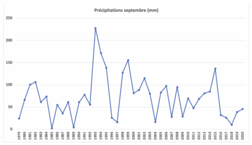 Enfin, le graphique ci-dessous représente l’évolution les quantités de pluviométrie reçues au cours du mois de septembre. Conformément aux observations de l’agriculteurs, les 5 dernières années présentent systématiquement de très faibles cumuls (< 50 mm).