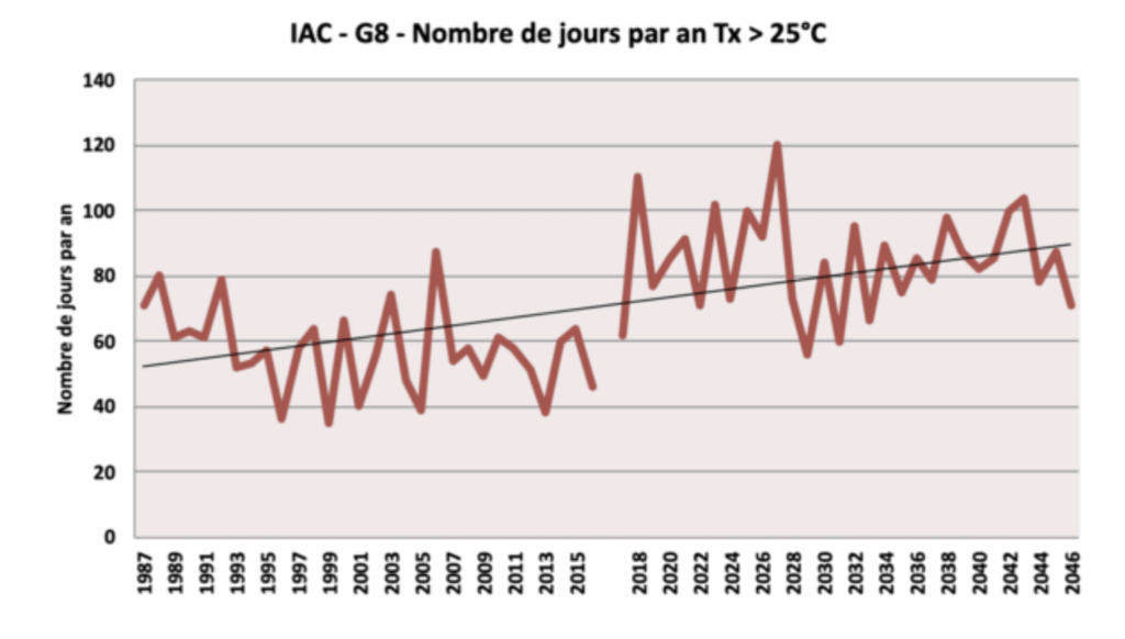 Le nombre de journées échaudantes (température maximale dépassant 25°C) est déjà en augmentation tendancielle sur la période passée. Ces augmentations vont se poursuivent d’ici 2050 sur un rythme identique, avec pour certaines années l’intervention de valeurs records.