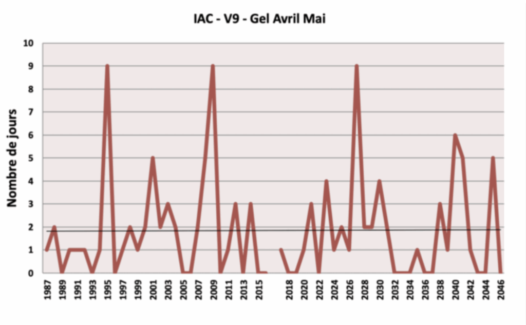 Le risque de gel tardif au mois d’avril semble se maintenir à un niveau identique à la situation actuelle : on note l’occurrence possible fréquemment de 1 à 3 jours sur la période, avec certaines années exceptionnelles maintenant les records atteints lors de la période passée (9 jours).